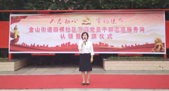 黃石高新物業(yè)公司董事長鄒丹在社區(qū)下沉黨員干部志愿服務崗認領暨授旗儀式上做動員講話