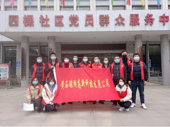 黃石高新物業(yè)公司董事長鄒丹為社區(qū)科普宣教、助老助困等5支志愿服務隊授旗并合影留念