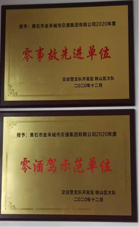 交巡警支隊(duì)開發(fā)區(qū) 鐵山區(qū)大隊(duì)授予的2020年度零事故先進(jìn)單位、零酒駕示范單位