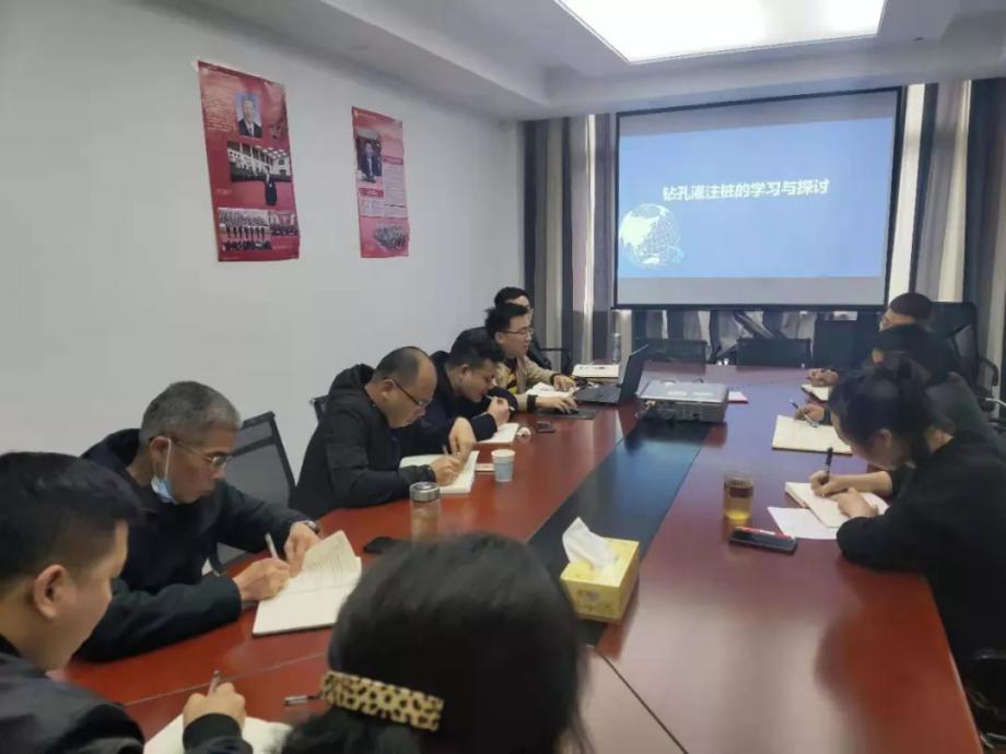 會上,公司工程主管以“鉆孔灌注樁施工工藝”為主題,圍繞工藝流程、實施和驗收要點、質量控制等方面,進行詳細講解;其他工程技術人員結合自身管理經驗,開展交流發(fā)言。