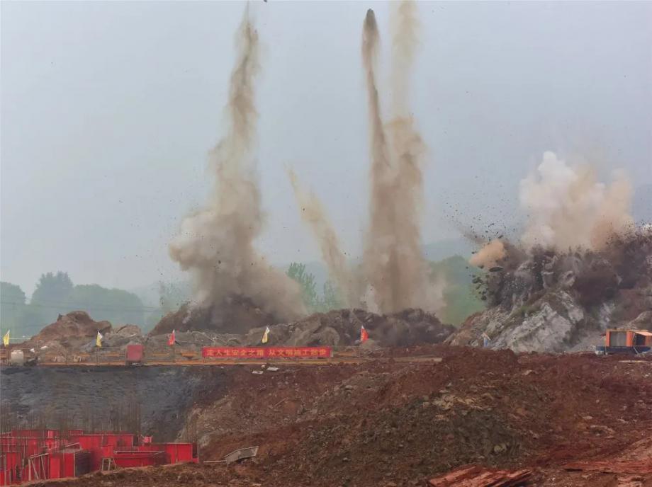據(jù)勘察,現(xiàn)場(chǎng)地質(zhì)條件復(fù)雜罕見(jiàn),需爆破石方總量約10萬(wàn)立方米。為此,該公司積極組織各參建單位和有關(guān)專家,通過(guò)多輪現(xiàn)場(chǎng)踏勘和集中研討,最終確定采用機(jī)械鉆孔填充炸藥的方式,分15次實(shí)施爆破,本次石方爆破量約8000立方米。