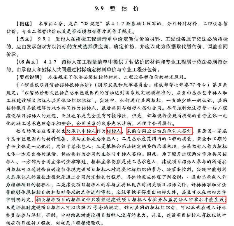 2.2《2013建設(shè)工程計價計量規(guī)范輔導(dǎo)》第9.9條要點(diǎn)說明,對暫估價招標(biāo)程序及價款調(diào)整做了進(jìn)一步的說明,約定如下: